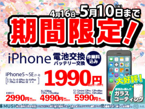 4/16(土)~5/10(火)の期間限定で、iPhone全機種のバッテリー交換が大変お得にできちゃいます!!